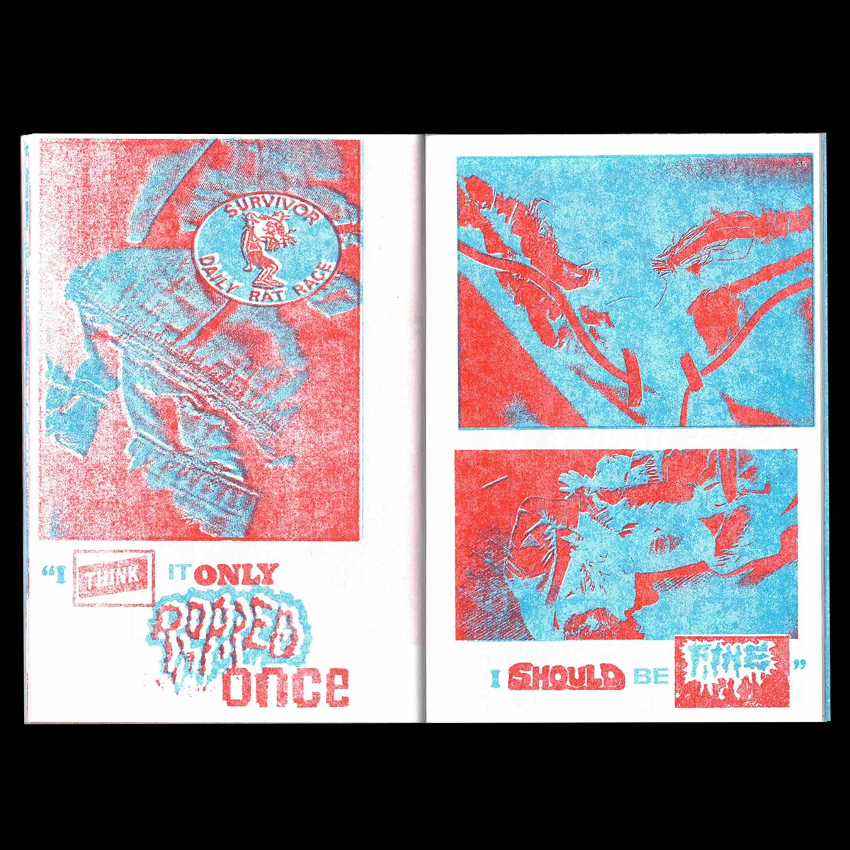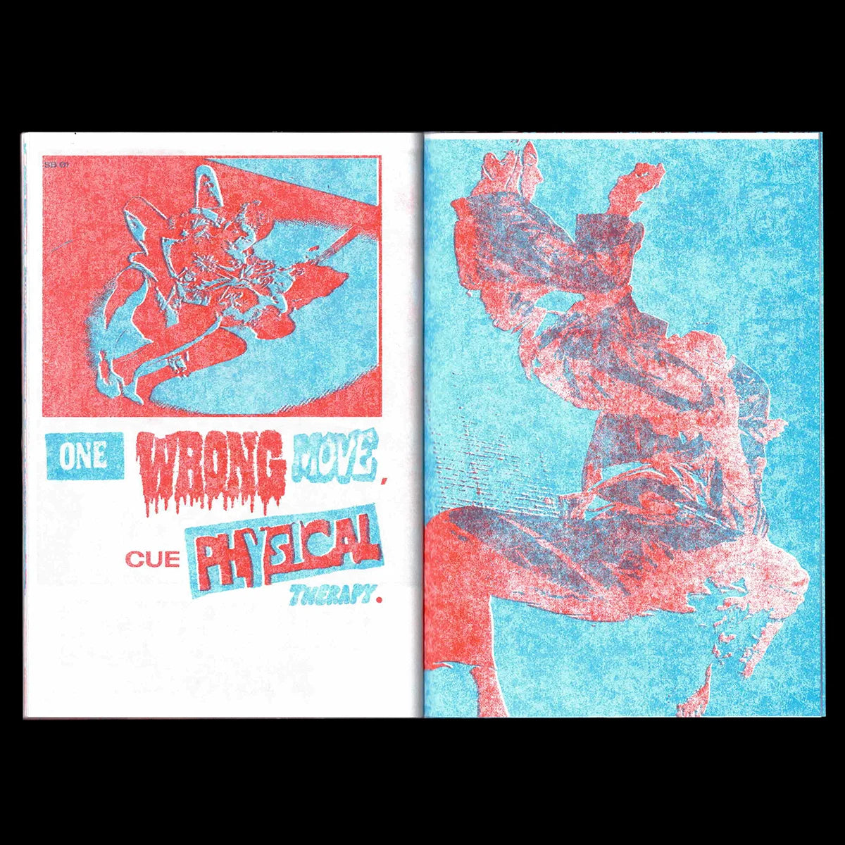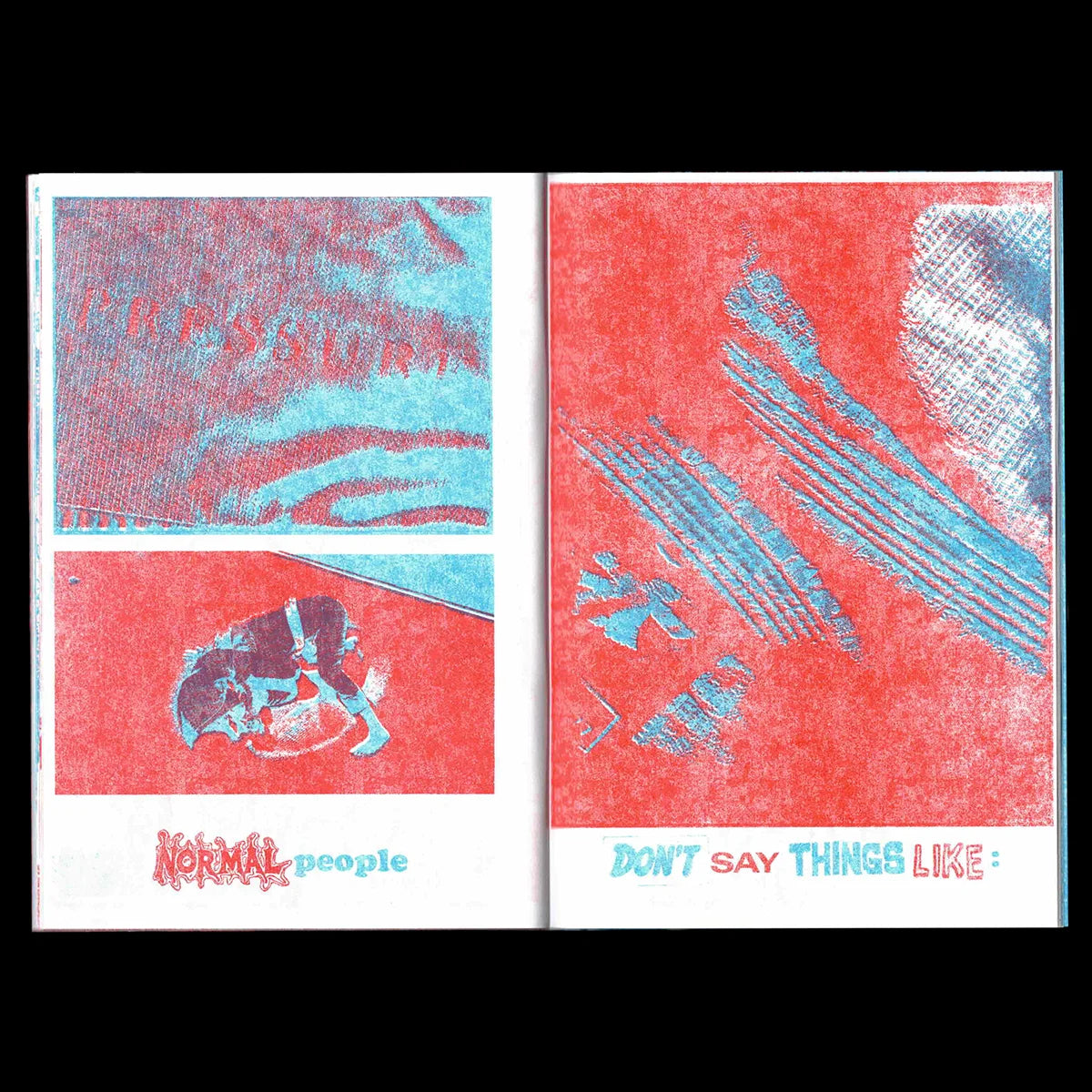 2 color risograph print, 48 page, 5” x 7.25,” staple-bound zine. Hand-printed and assembled in Los Angeles on technology from the 1980s, so there’s bound to be some imperfections in the art form. As there always is and always will be.